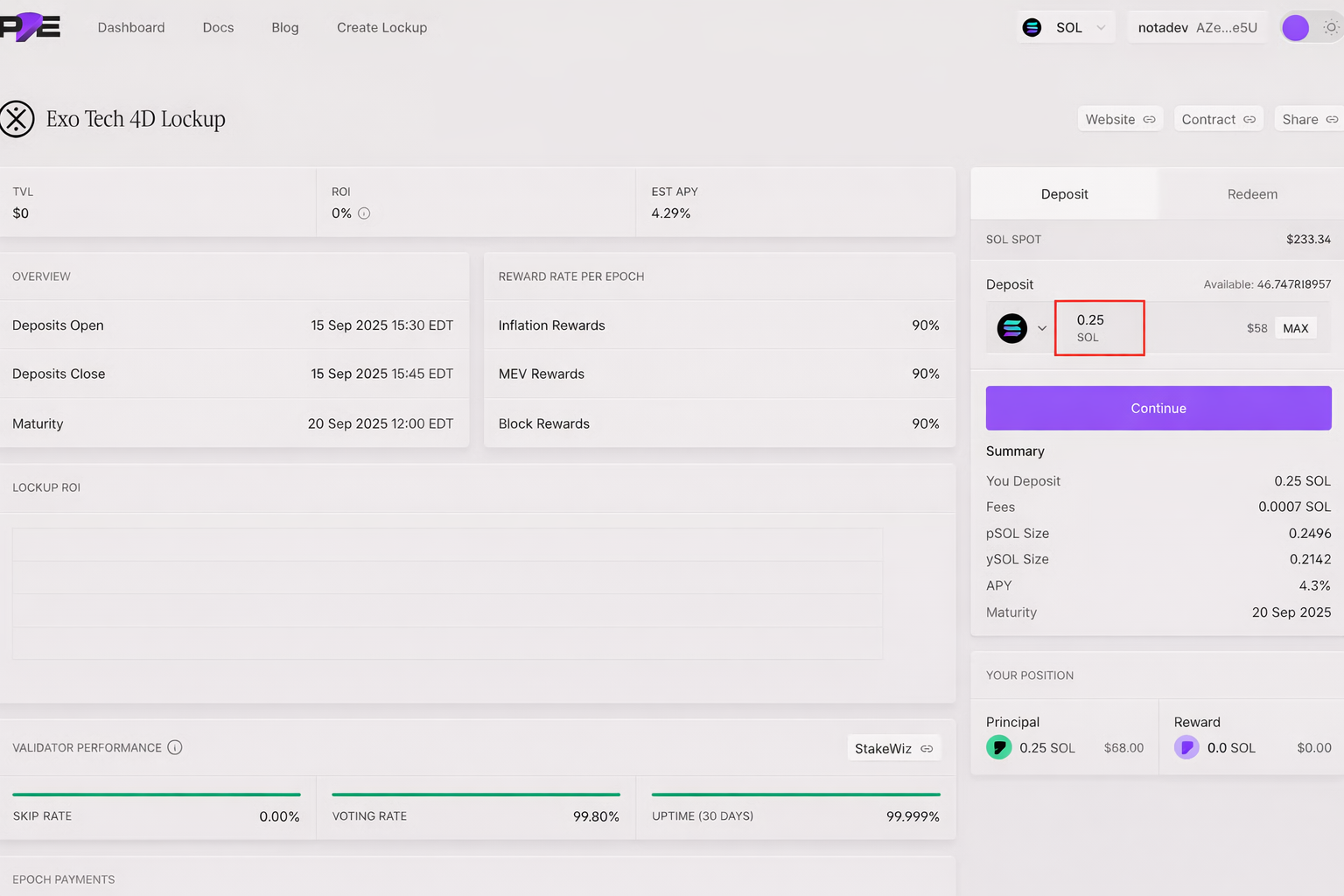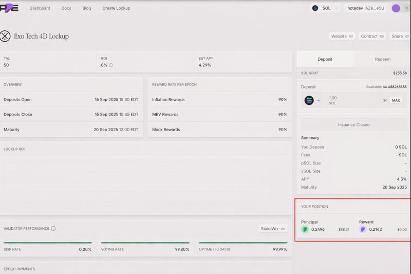 After a successful deposit, your position will appear in the Your Position panel (bottom right).