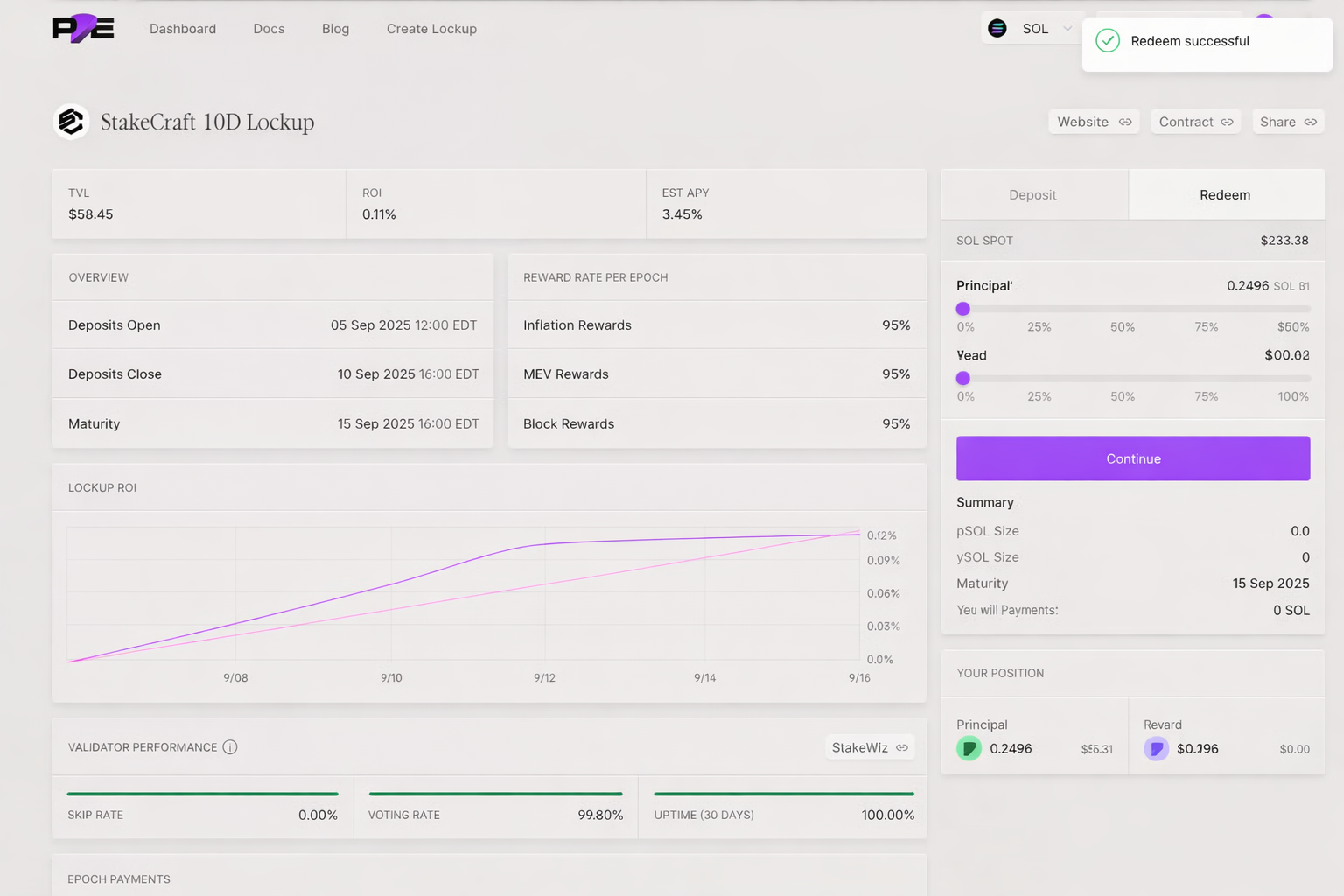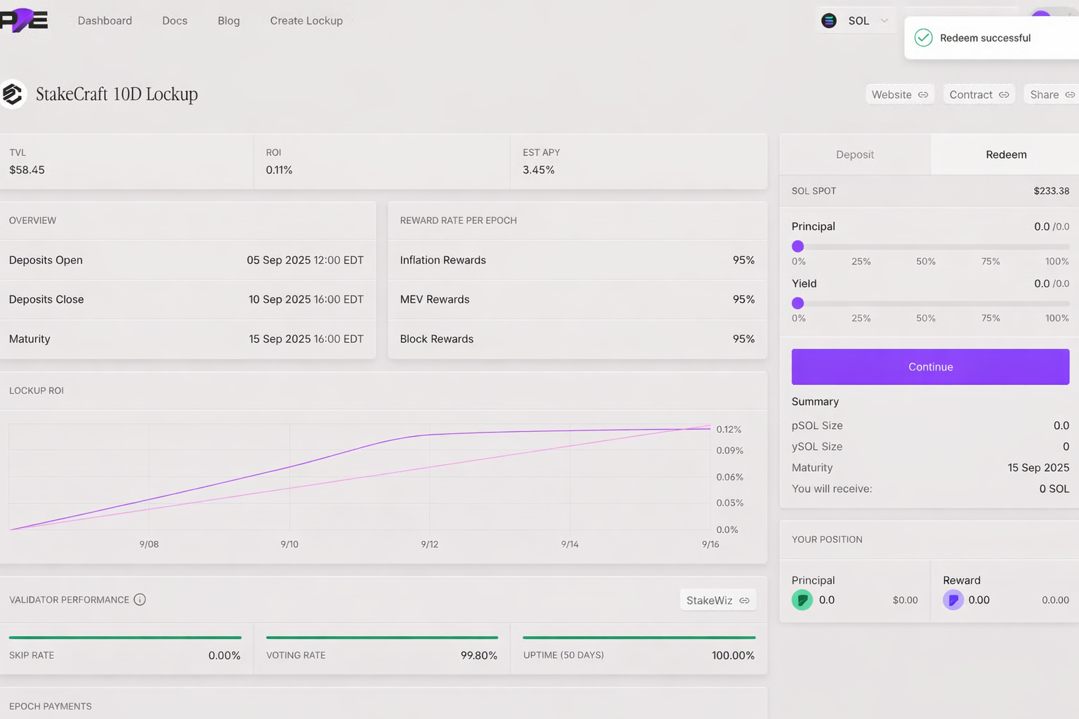 Redemption is only possible once the lockup has reached maturity. Attempting to redeem early will result in 0 SOL received until the full Lockup duration has elapsed.