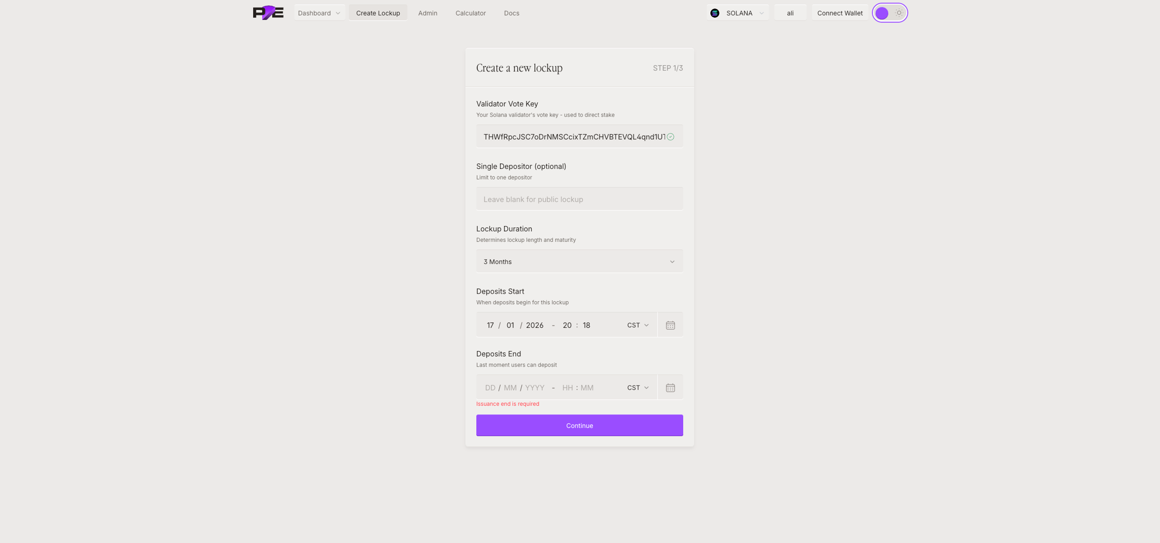 If you have not yet completed the whitelisting approval process, please refer to the Validator Onboarding section for detailed instructions on how to register your validator, add admins, and gain access to creating Lockups.