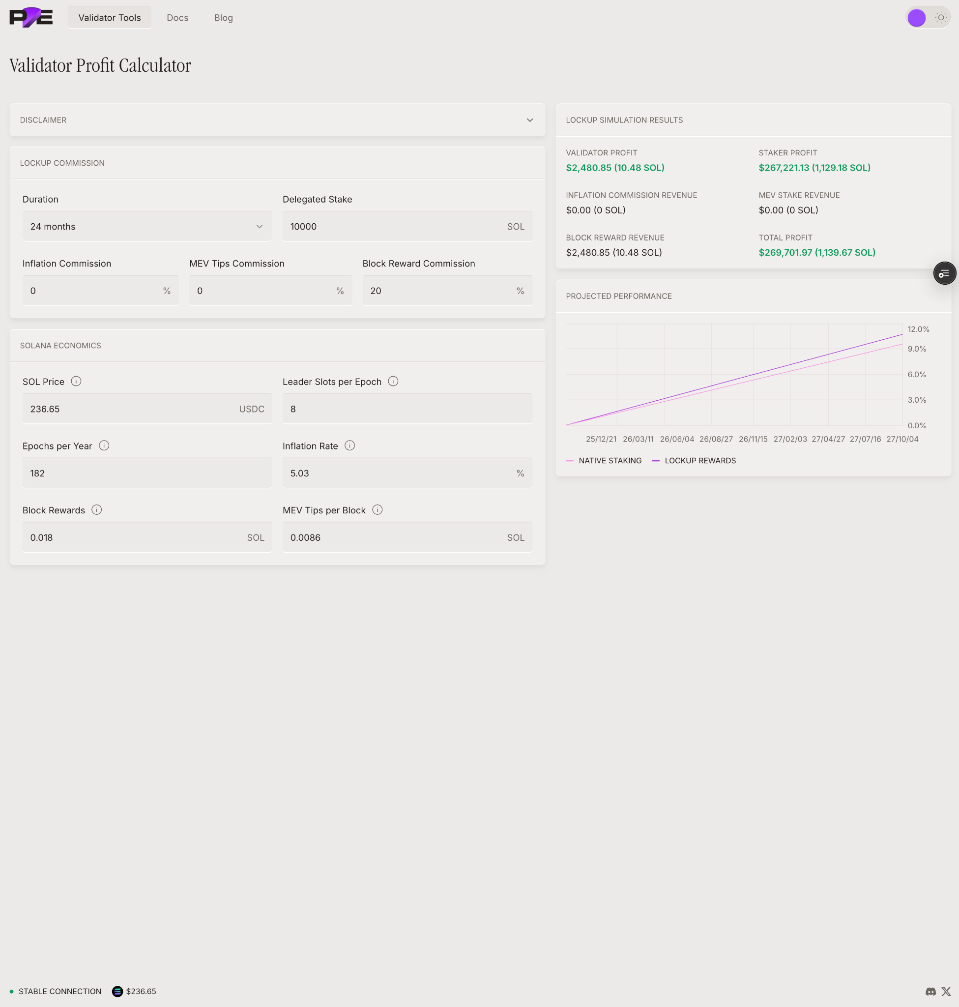 The calculator helps Solana validators estimate their total profits and staker returns under different lockup terms and commission structures using real Solana economic parameters.
